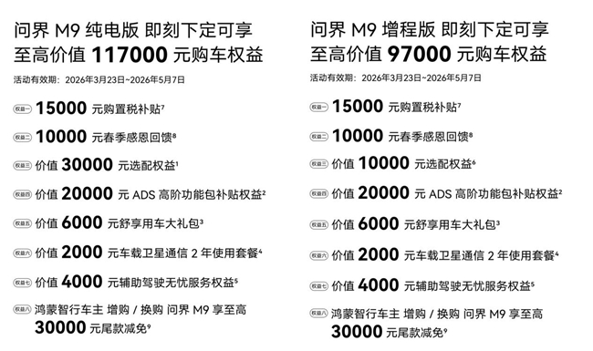 在硬核产品力之外,问界以用户为中心,推出一站式上牌等便捷服务,优化全流程体验,让用户尽享高效、便捷的交付体验。同时,车辆还推出限时购车福利:截至5月7日,下定问界M9纯电版至高可享117000元购车权益,下定问界M9增程版至高可享97000元权益,让更多用户轻松解锁新豪华出行体验。